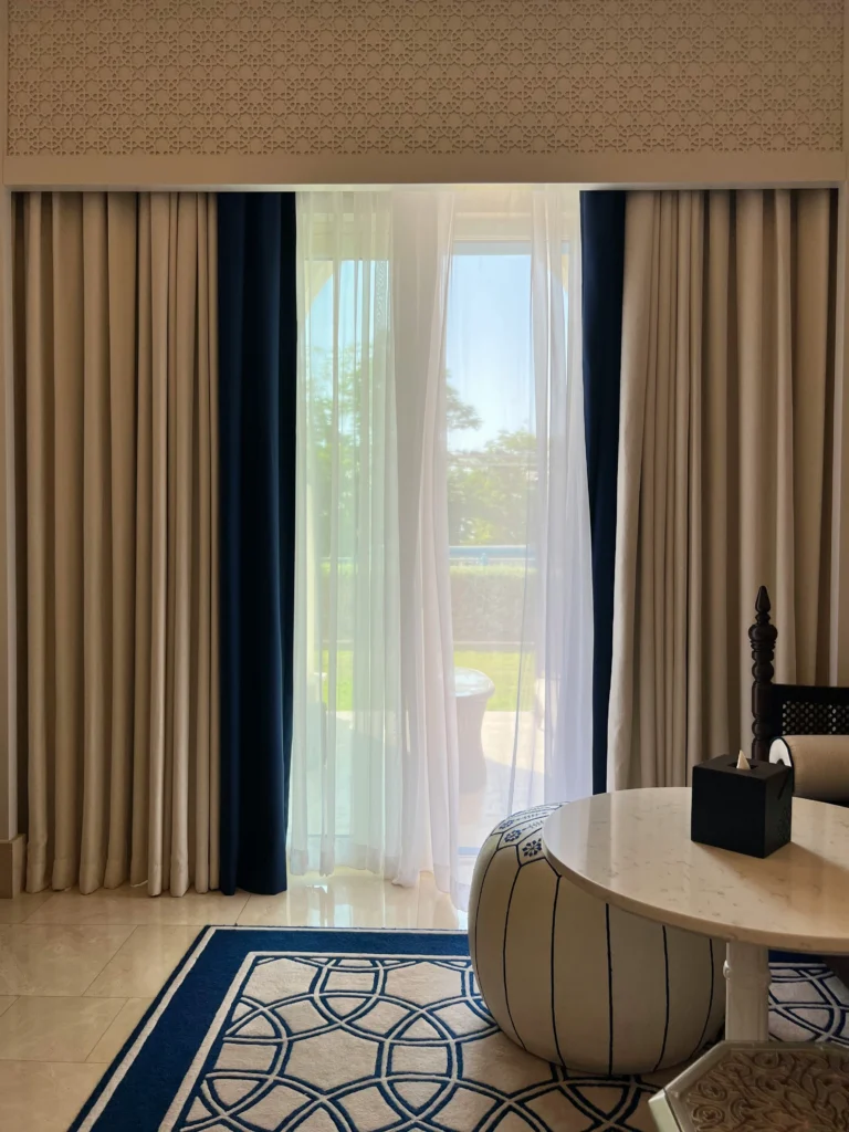 Go for heavy floor-length drapes in navy blue paired with bright white sheers to control the natural light. Place a large, structured pouf on a geometric blue and white rug for flexible, casual seating. Use a round marble-topped coffee table as your centerpiece to hold your tissues and trinkets. Keep the walls neutral, but look for spaces with intricate architectural detailing near the ceiling. It’s all about creating an airy, open atmosphere that feels like a vacation.