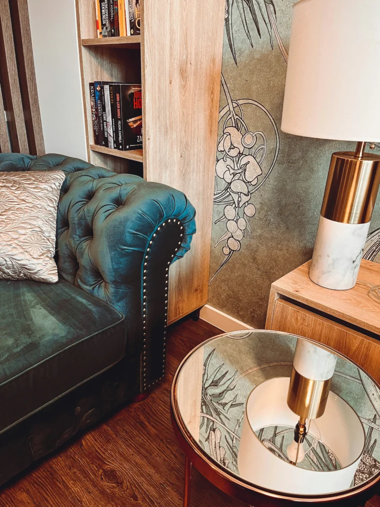 Choose a deep teal Chesterfield sofa to anchor the room with a touch of luxury. Place a metallic side table with a mirrored top right next to it to catch the light. Opt for a lamp featuring a marble base and gold accents for a sophisticated mix of materials. Don’t be shy with the walls—go for a bold, botanical print wallpaper to create drama. Keep your favorite thriller novels stacked on a light wood bookshelf within arm’s reach for those lazy Sunday afternoons.