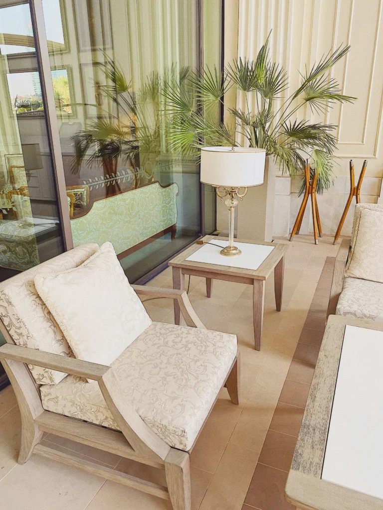 Choose sturdy wooden patio furniture topped with plush, patterned beige cushions for comfort. Set a square wooden table between the seats to hold a sophisticated crystal lamp—adding an unexpected indoor touch to the outdoors. Place a large potted palm in the corner to blend with the lush greenery reflected in the glass. Ensure your sliding glass doors are kept clean to seamlessly connect your interior living space with this airy terrace.