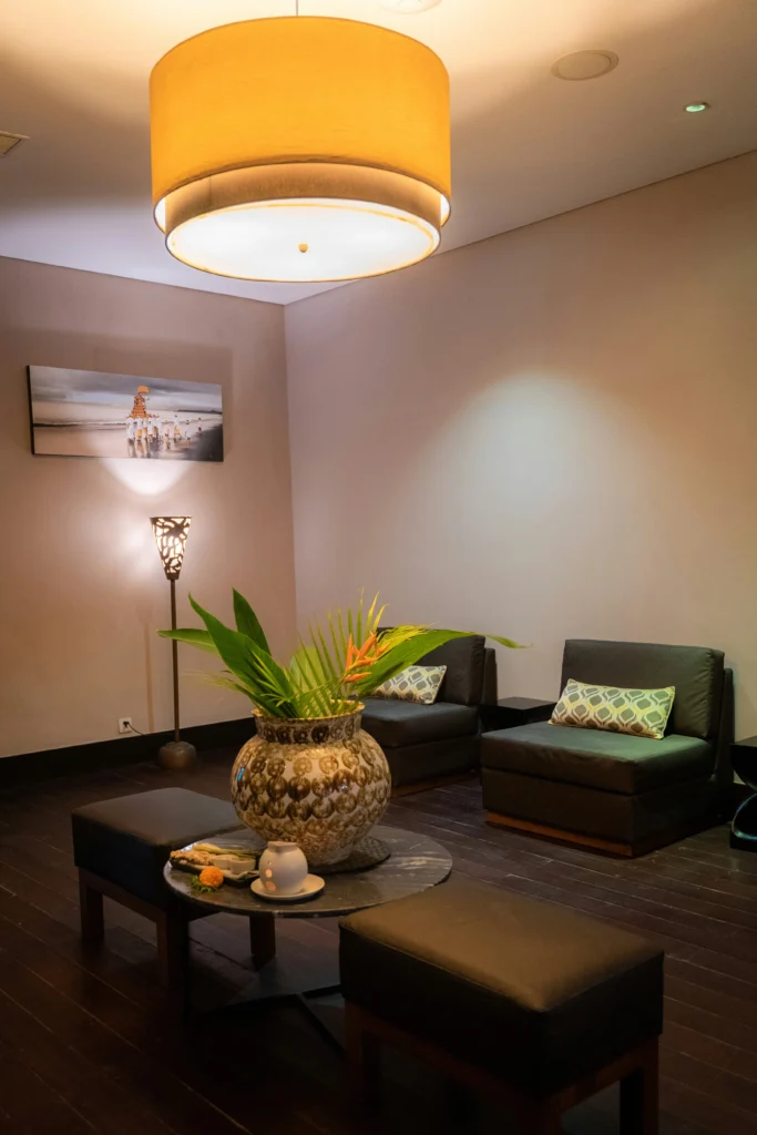 Go for low-profile, armless lounge chairs in a dark grey fabric for a grounded feel. Center the room with a massive, tiered drum pendant light that radiates a warm, yellow glow. Decorate a low round table with a large ceramic vase filled with tropical leaves to bring life to the space. Add a standing floor lamp with cutout patterns in the corner to cast interesting shadows on the wall. Keep the lighting dim to encourage total relaxation.