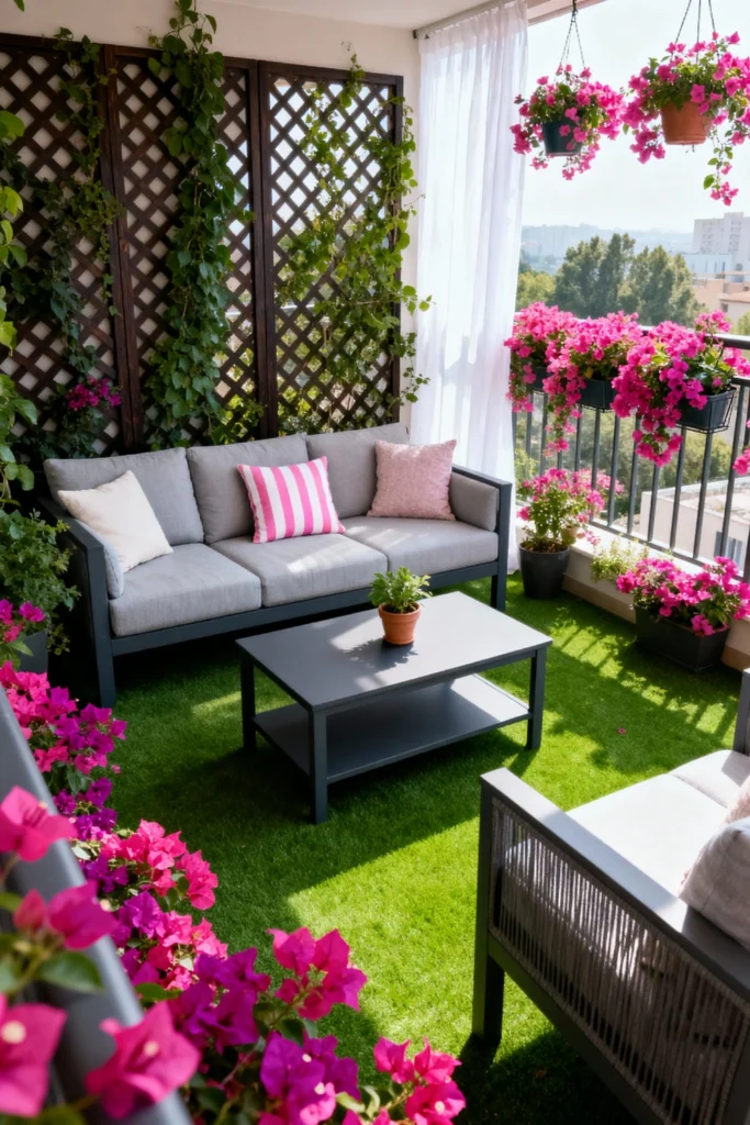 Transform a small balcony by laying down vibrant artificial grass for an instant garden feel. Opt for a sleek, grey modern sofa and add a playful touch with a hot pink striped throw pillow. Install a dark wooden trellis against the wall and let green vines climb up to maximize vertical space. Hang trailing pink bougainvillea from the railing in dark planters. Finish it off with sheer white curtains to catch the breeze and soften the sunlight.