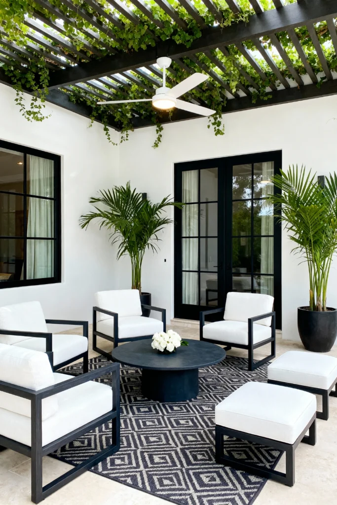 Design a sophisticated space with a stark black and white color palette. Opt for modern armchairs featuring bold black frames and thick, white cushions. Center the layout around a smooth, heavy black concrete coffee table. Install a black slatted pergola and let delicate green vines weave through the top. Ground the area with a dark, patterned flat-weave rug over light stone tiles. Frame the sleek black French doors with tall, lush green palms in large black pots.