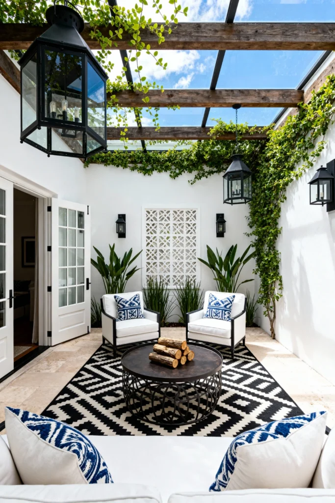Embrace an airy feel with a glass-roofed courtyard supported by rustic wooden beams. Hang oversized, black metal lantern pendants to anchor the tall space. Lay down a bold, black and white geometric patterned rug to define the seating zone. Choose crisp white armchairs with dark wood frames and accent them with intricate blue and white patterned pillows. Let vibrant green climbing vines trail down the stark white walls to bring life to this elegant, enclosed sanctuary.