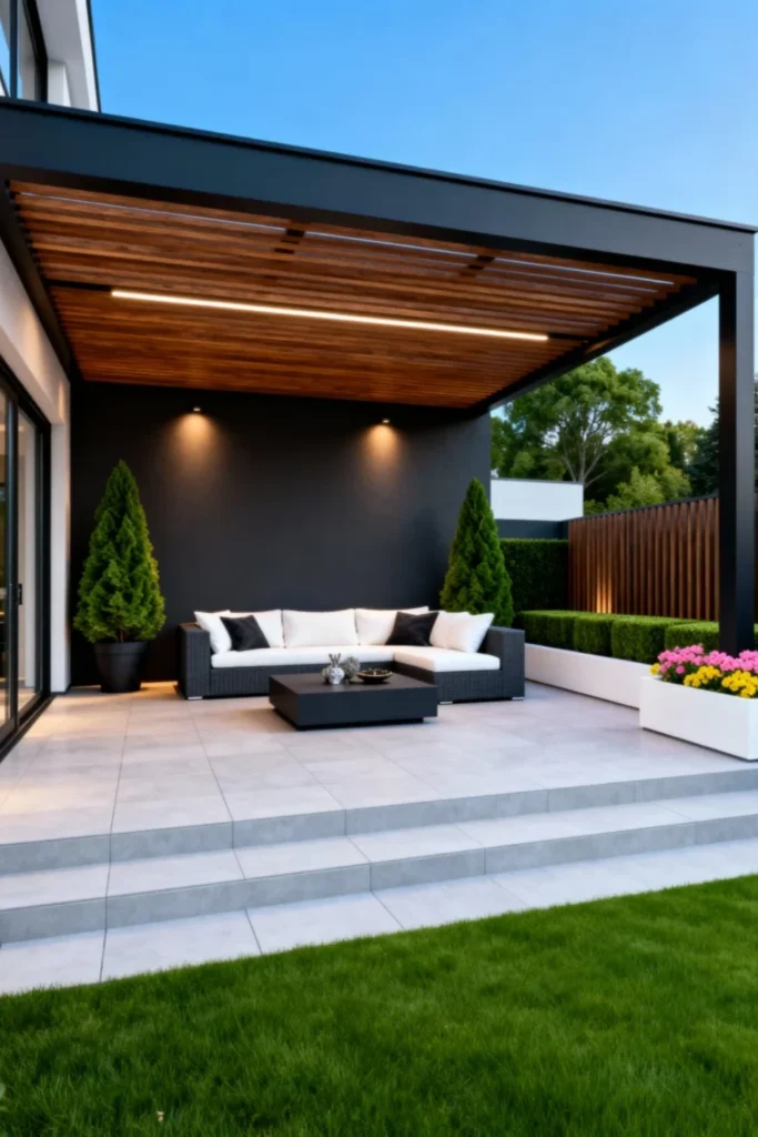 Create a striking contrast with a bold black accent wall and a matching black metal pergola structure. Warm up the ceiling with horizontal wooden slats and a sleek, integrated LED light strip. Select a low-profile, black outdoor sectional with crisp white cushions. Keep the flooring clean and contemporary with large, light grey stone tiles. Flank the seating area with tall, manicured evergreen shrubs in dark modern planters for a polished, high-end resort look.
