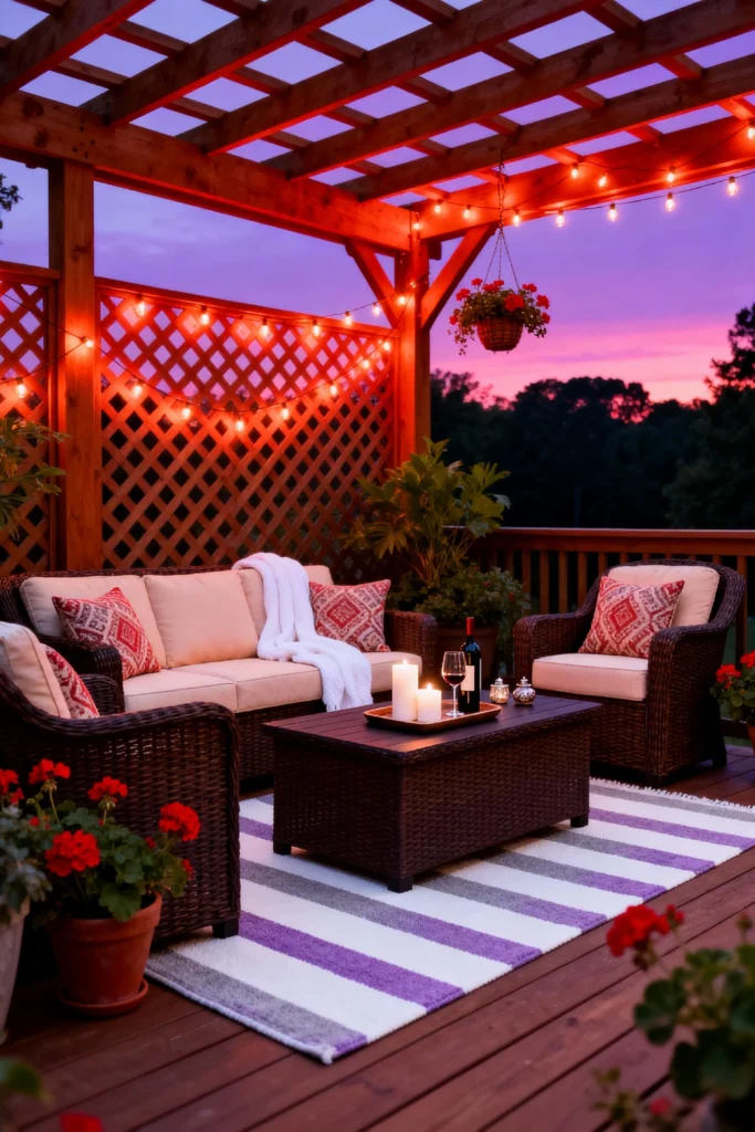Set the mood under a wooden pergola by draping warm, glowing string lights overhead. Arrange a dark espresso-colored wicker seating set with plush, cream-colored cushions. Throw in some soft red patterned pillows for a cozy, inviting contrast. Roll out a large, striped rug in shades of grey and purple to tie the space together.