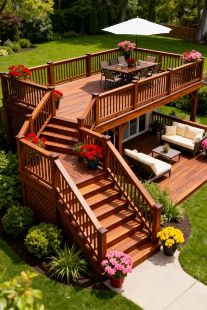 Build out a stunning multi-level deck using rich, warm-toned wood. Dedicate the spacious upper tier to al fresco dining with a large wooden table and an umbrella for shade. Use wide, sturdy stairs to connect to a cozy lower lounging zone tucked underneath. Furnish the bottom area with plush, cream-cushioned wicker seating. Brighten up the rich wood by placing terracotta pots filled with vibrant red and pink geraniums along the railings and stair corners.