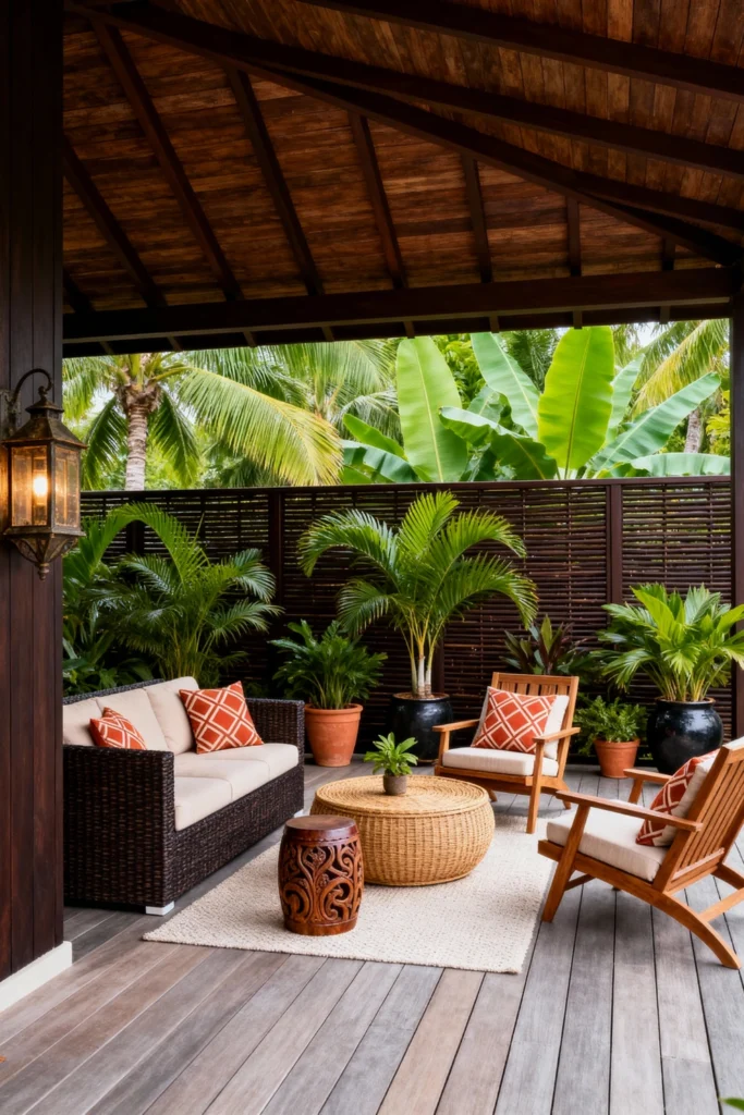 Choose a deep brown wicker sofa and pair it with matching wooden armchairs for a grounded feel. Add pops of energy with bright orange, geometric-patterned pillows. Place a carved wooden drum stool next to a woven coffee table to mix textures beautifully. Surround the seating area with lush, oversized potted palms and tropical greenery to create a private jungle vibe. Keep the floor simple with a light, textured outdoor rug over natural wood decking.