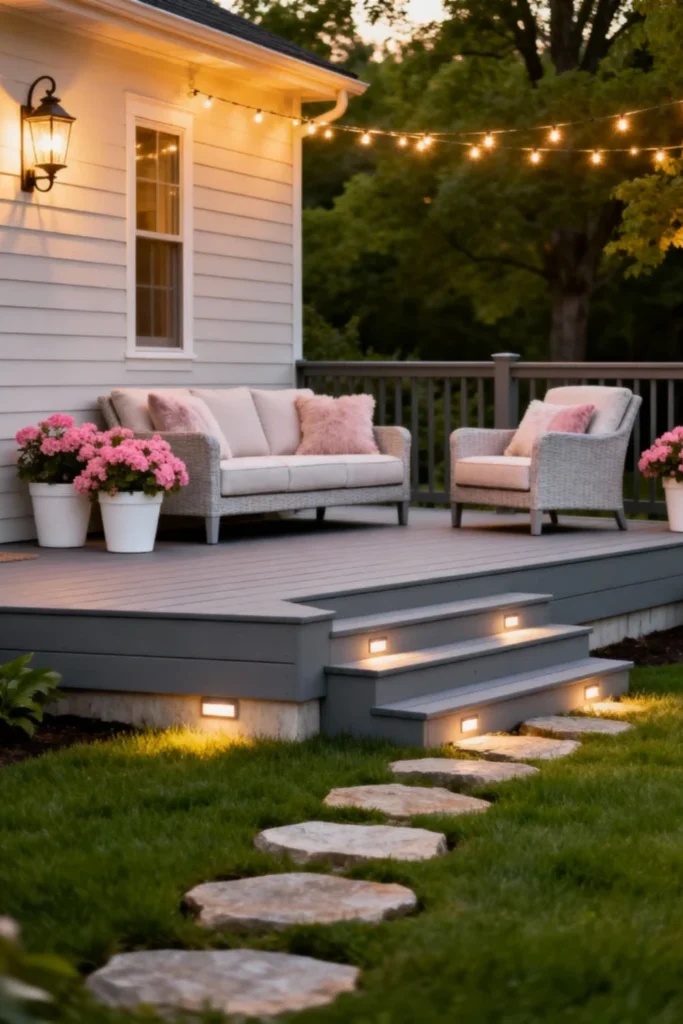Paint your wooden deck a soft, soothing grey to create a neutral foundation. Pick out elegant, light grey wicker armchairs and a matching sofa, topping them with fluffy pink throw pillows. Guide the way to the deck with natural stone pavers laid into the lawn. Install warm, glowing riser lights into the deck stairs for safety and ambiance. String festoon lights above the seating area to cast a soft, magical glow perfect for evening chats.