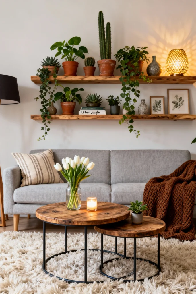Install raw-edge wooden floating shelves and pack them with trailing ivy, succulents, and cacti. Choose a simple, grey mid-century sofa and layer it with a chunky, rust-colored knit blanket for texture. Place a small candle on a rustic, round wooden coffee table to add a flickering warmth. Use a woven bamboo lamp to cast intricate shadows on the wall. This look is all about bringing the outdoors in and creating a textured, organic sanctuary.