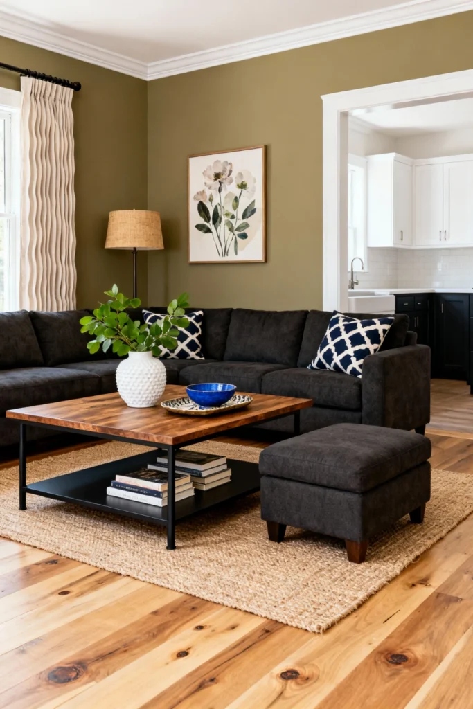 Go bold with olive green walls to create a cozy, den-like atmosphere. Opt for a large, charcoal-colored sectional that invites the whole family to pile on. Center the space with a sturdy industrial coffee table featuring a wood top and metal shelf. Layer a natural jute rug underneath to add grit and texture. A simple botanical print and a textured white vase keep the decor grounded. It’s rugged, comfortable, and perfect for lazy Sundays.