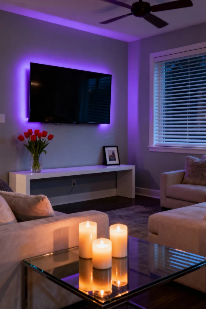 Install purple bias lighting behind your mounted TV to reduce eye strain and set a moody tone. Arrange a trio of large pillar candles on a glass and chrome coffee table to mix digital cool tones with analog warmth. Keep the furniture soft and plush, like a microfiber sectional. A simple white console table keeps the focus on the screen and the light. It’s a modern, clean look that still feels incredibly cozy at night.
