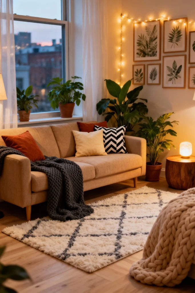Drape warm white string lights around a gallery wall filled with botanical prints for instant magic. Place plenty of potted plants on the windowsill to catch the fading sunset light. Layer a heavy, grey knit throw over a beige sofa to create a “snuggle here” zone. A small, warm-toned orb light on a wooden side table creates a dreamy, intimate atmosphere. This is the perfect corner for tea, a good book, and watching the city lights come on.