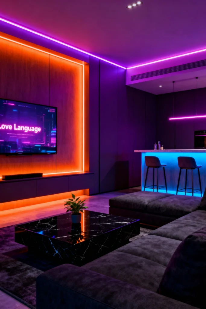 Ditch the overhead lights and install LED strips along the ceiling and behind cabinetry for a futuristic glow. Mix purple and cyan lighting to separate the lounge area from the bar. Choose low-profile, dark velvet furniture that absorbs the light, making the room feel like a private club. A sleek, black marble coffee table reflects the neon colors beautifully. This is the ultimate setup for immersive movie nights or gaming sessions where vibe is everything.