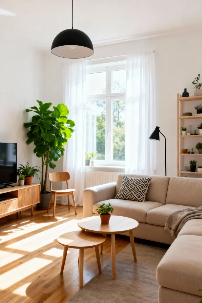 Embrace the light! hang sheer white curtains to diffuse the sunlight and make the room feel ethereal. Anchor the corner with a massive Fiddle Leaf Fig tree—the green pop against white walls is instant energy. Stick to light oak furniture with clean, simple lines. A matte black dome pendant light adds just the right amount of contrast so the room doesn’t float away. Keep your sofa neutral, but add a geometric patterned pillow to keep things interesting.