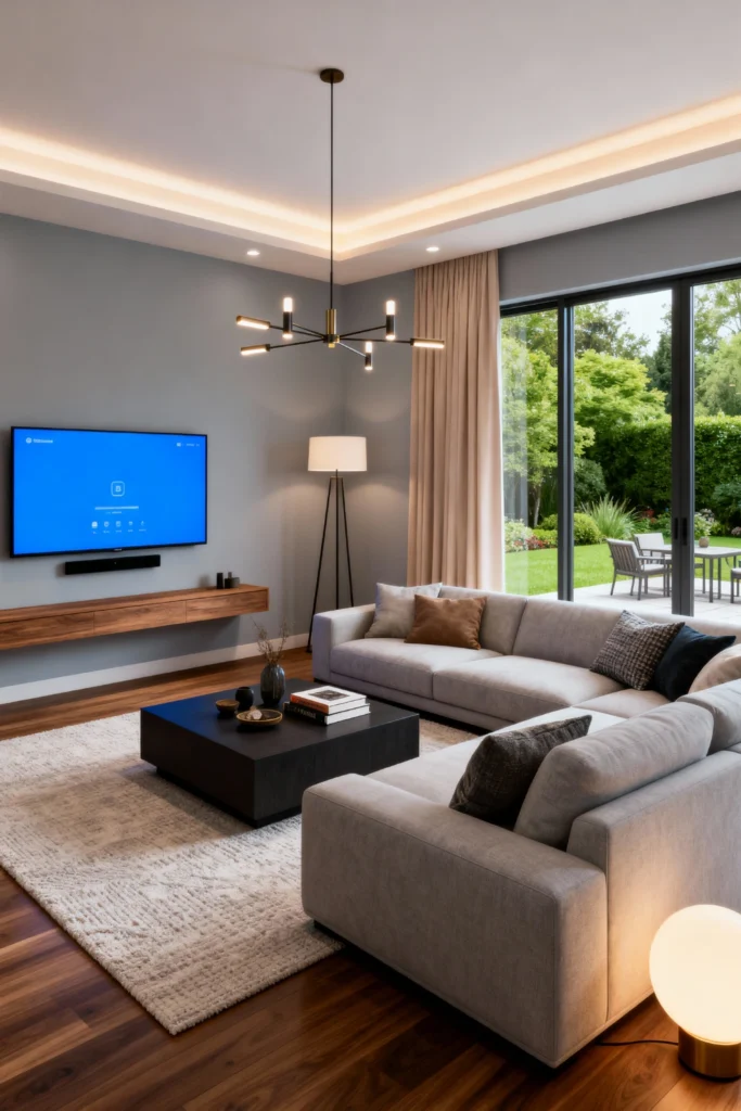 If you have a view of the garden, let the windows be the main event. Choose a large, light grey L-shaped sofa with clean lines to maximize seating without blocking the sightlines. Hang a modern, spindly black chandelier to draw the eye up. Use a solid, blocky black coffee table to anchor the light rug. Keep the accessories minimal—just a few curated books and a ceramic vase. This style breathes; it’s uncluttered and peaceful.