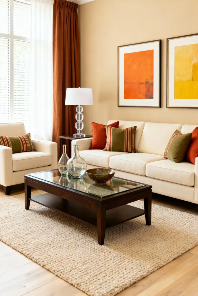 Start with a neutral beige palette on the walls to keep things grounded, then add drama with floor-to-ceiling rust-colored drapes. Choose a pair of cream upholstered armchairs and toss on striped lumbar pillows for a classic, tailored look. Hang large abstract art framed in black to create a bold focal point. Finish the space with a dark wood coffee table topped with glass, and place a crystal lamp nearby to catch the light. It’s a timeless setup that feels sophisticated yet incredibly inviting.
