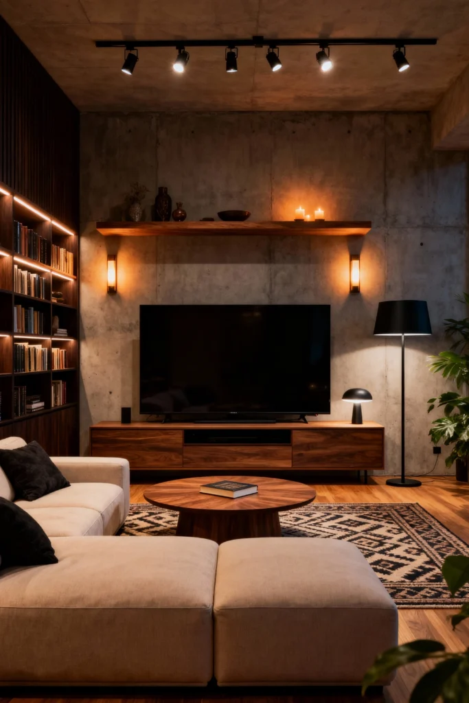 Celebrate raw concrete walls, but warm them up with rich walnut shelving and warm LED cabinet lighting. Install a black track lighting system to highlight your book collection. Choose a low, round wooden coffee table to encourage conversation flow. Add a patterned rug with geometric designs to break up the wood floor and add a touch of history. It’s a masculine, architectural look that feels curated and deeply personal.
