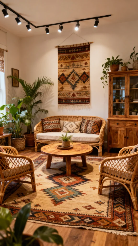 Soft lighting can really change the feel of your living room. Using warm lights and natural materials makes the space cozy and inviting. Think about adding some candles or wooden lamps for that earthy boho touch!