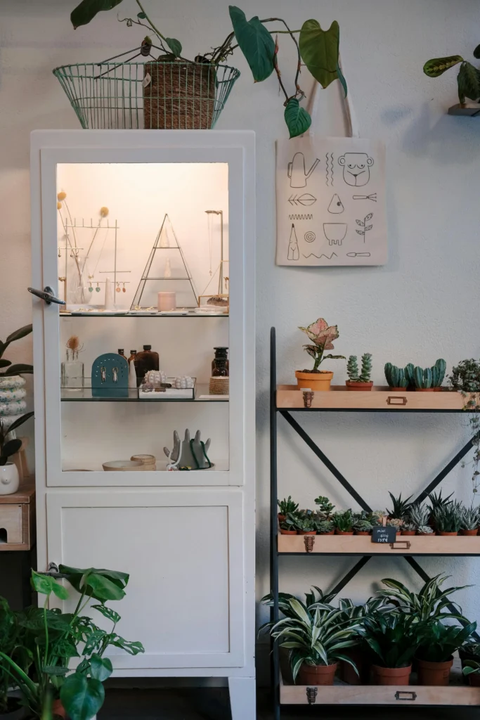 Find a vintage glass-front medical cabinet and paint it a crisp white. Install soft, warm interior lighting to highlight small treasures like delicate jewelry, crystals, or brass stands. Pair the cabinet with a simple black metal rack placed right next to it. Fill the rack’s shelves with a collection of small succulents and cacti in uniform terracotta pots. Hang a canvas tote or simple line art on the wall above for a casual touch.