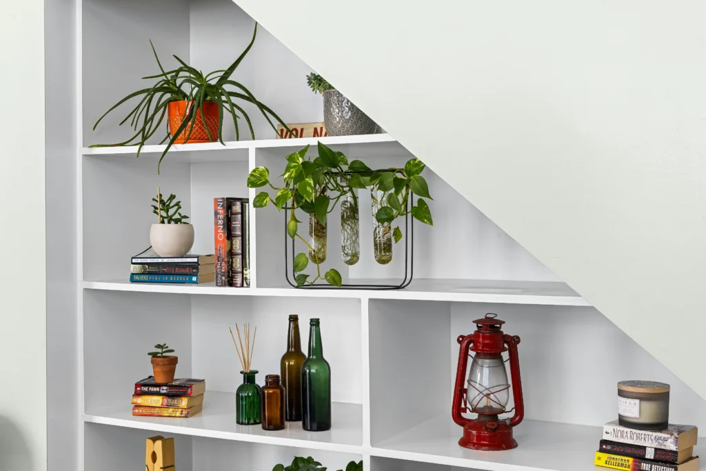 Build custom white shelving directly into the angled space under your staircase. Use the differing heights to display objects of various sizes, placing taller items in the high peaks. Display a vintage red metal lantern as a bold focal point. Use a modern, black metal test-tube stand to propagate plants in the middle section. Stack thriller or mystery paperbacks horizontally to create makeshift bookends for small succulents.