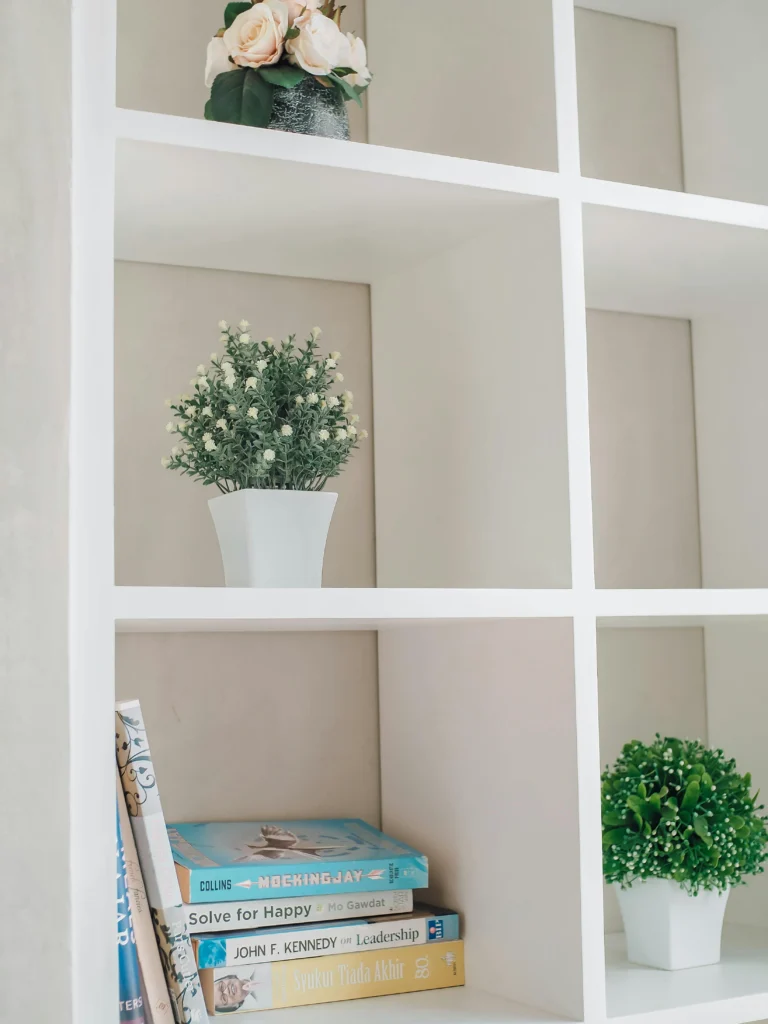 Use a white cube storage unit to create a clean grid. Place identical small potted plants with white flowers in alternating cubbies to establish a rhythm. Stack books horizontally in the remaining squares, keeping the spines facing outward. Stick to a strict color palette of white, green, and pastel book covers to maintain a calm visual. Ensure every cubby has exactly one focal point—either a plant or a book stack—to avoid messiness.