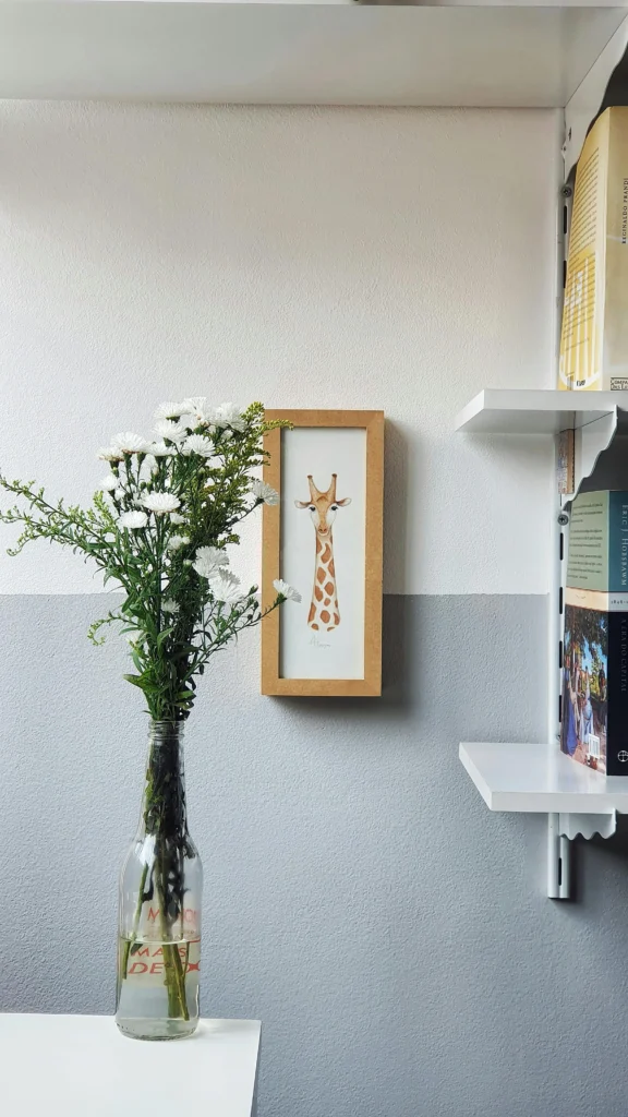 Lean a narrow, quirky framed illustration—like a giraffe or animal portrait—against the wall. Reuse a clear glass soda or water bottle as a vase for a tall spray of white wildflowers. Keep the surrounding shelf space entirely white and free of clutter to let these two items breathe. Paint the lower half of your wall a soft grey to create a visual horizon line that anchors the shelf.