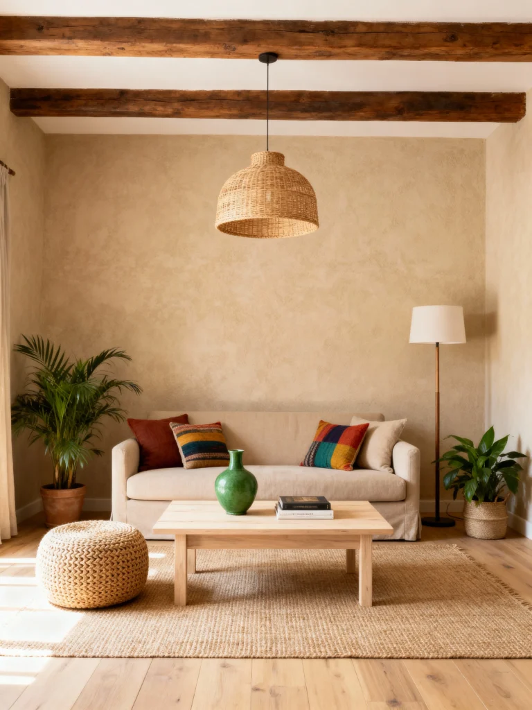 A cozy living room filled with natural textures can really bring warmth to your space. Think about adding wooden furniture, like a chunky coffee table or shelves, to create an inviting feel. Pair these with soft textiles such as woven rugs and knitted throws to add comfort and depth.