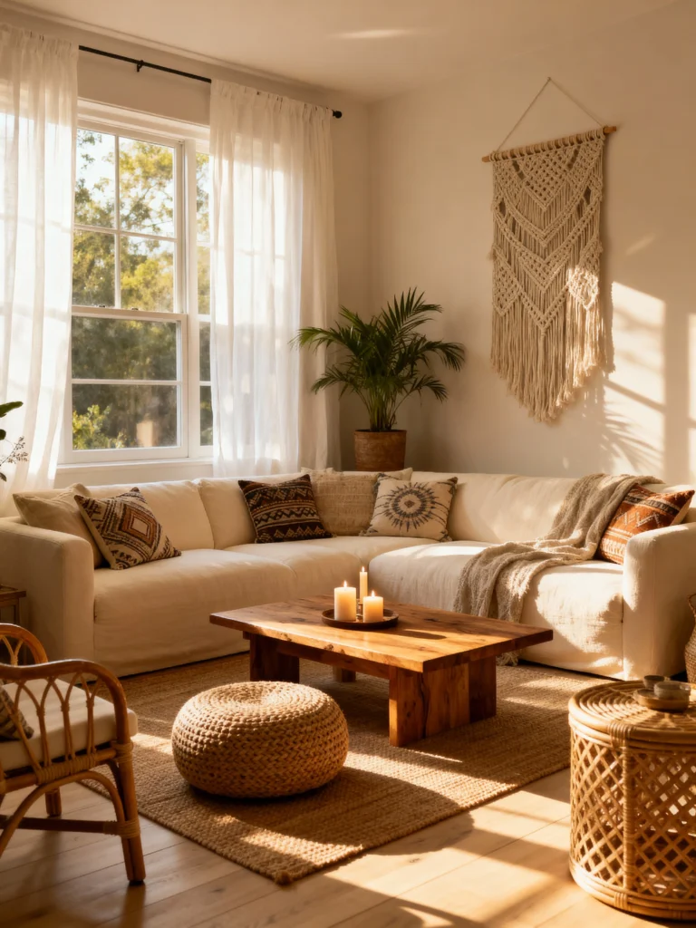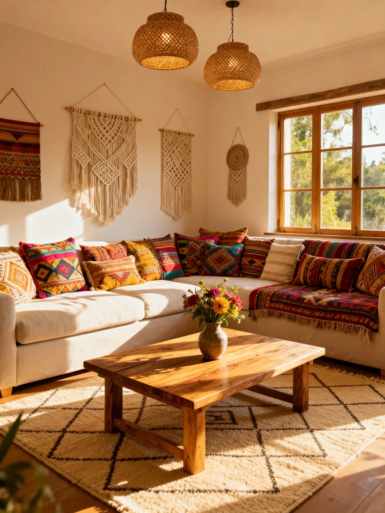 Modern boho living room decor blends eclectic style with cozy vibes, creating a space that’s both inviting and chic. Think natural materials, layered textiles, and a mix of bold patterns that reflect your personality while keeping comfort in mind. It’s all about creating a laid-back atmosphere that feels stylish yet lived-in, perfect for relaxing or entertaining.