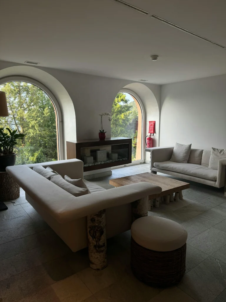 These arched windows are absolutely stunning! They perfectly frame the lush, green outdoor scenery, turning the windows themselves into architectural art. The low-profile, neutral sofas with their natural wood accents (look at the birch log bases!) create a cozy, organic feel.