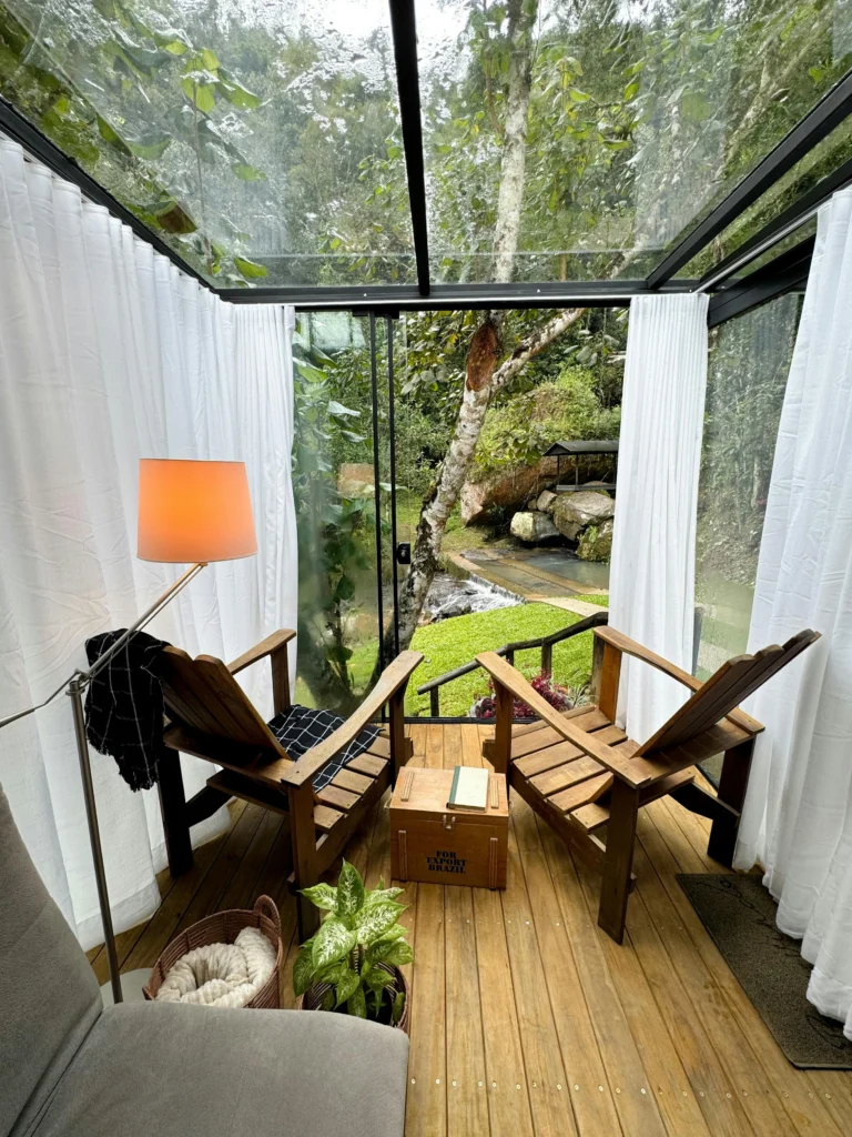 This little spot is pure nature immersion! The glass roof and walls make you feel totally surrounded by the forest, even when you’re cozy inside. The simple wooden chairs and the floor lamp create a comfortable, minimalist space perfect for watching the rain or enjoying the sounds of the stream.