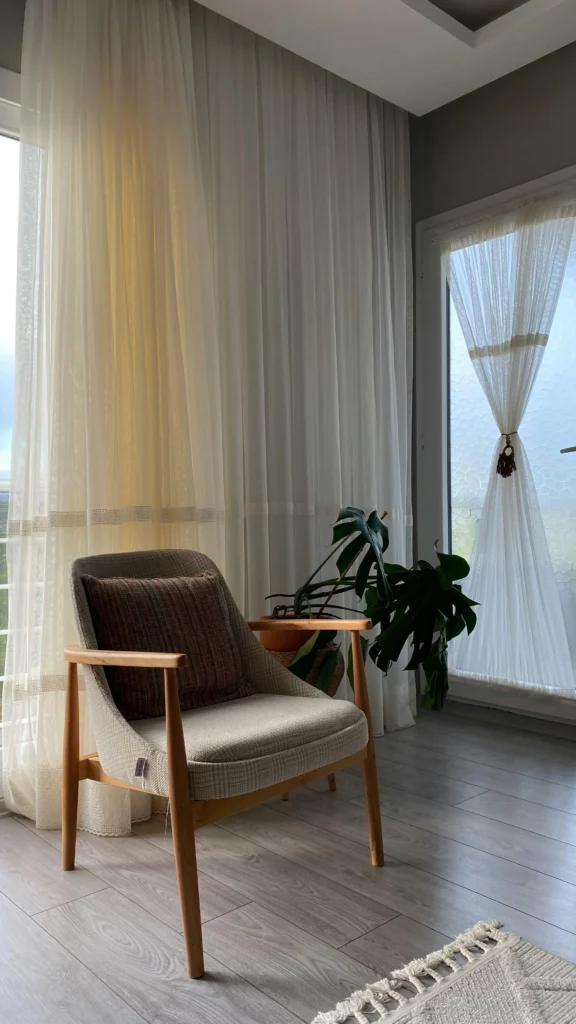This is the epitome of a cozy reading corner bathed in natural light! The light-filtering, sheer curtains create such a soft, ethereal glow, and the comfortable mid-century-style armchair looks like the perfect spot to curl up. Even the little plant adds a touch of life to this tranquil scene.