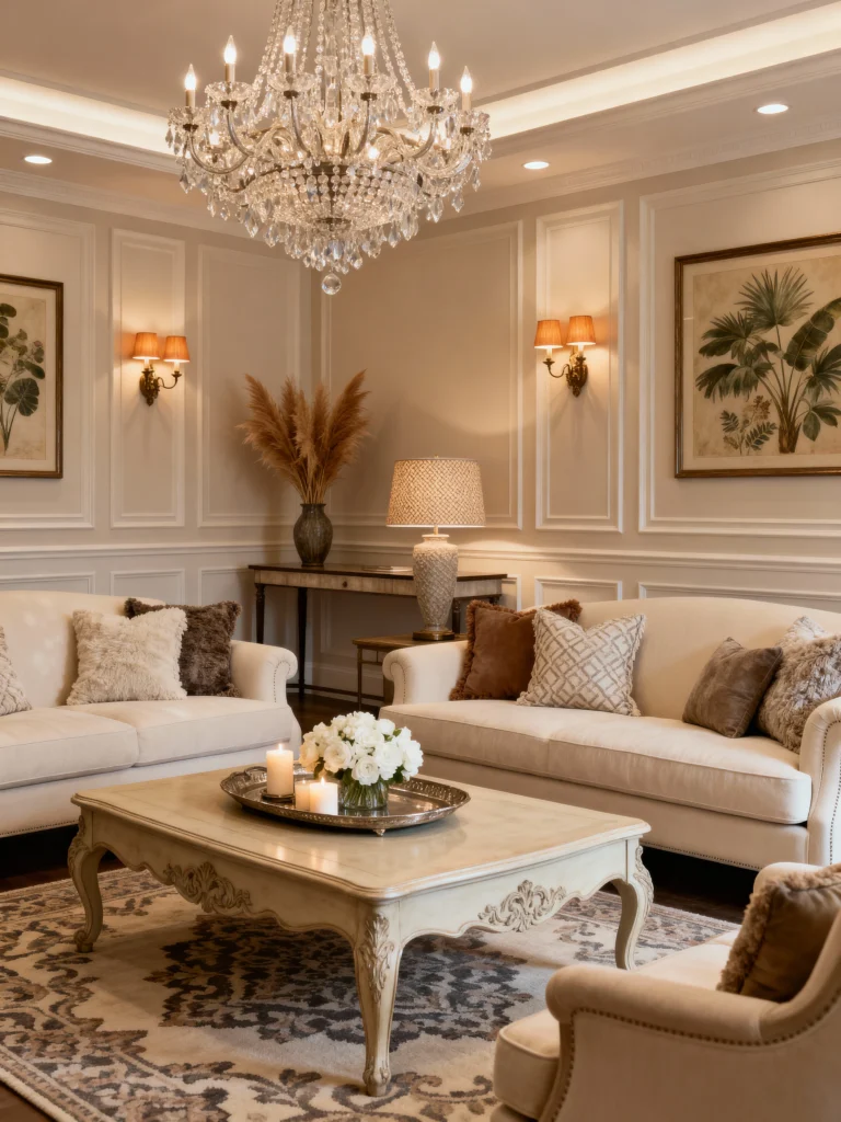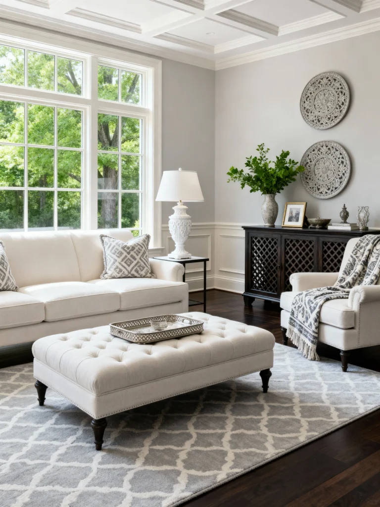 - Modern twist: Play with different shades of greige for a layered look. Add pops of color through artwork and cushions.