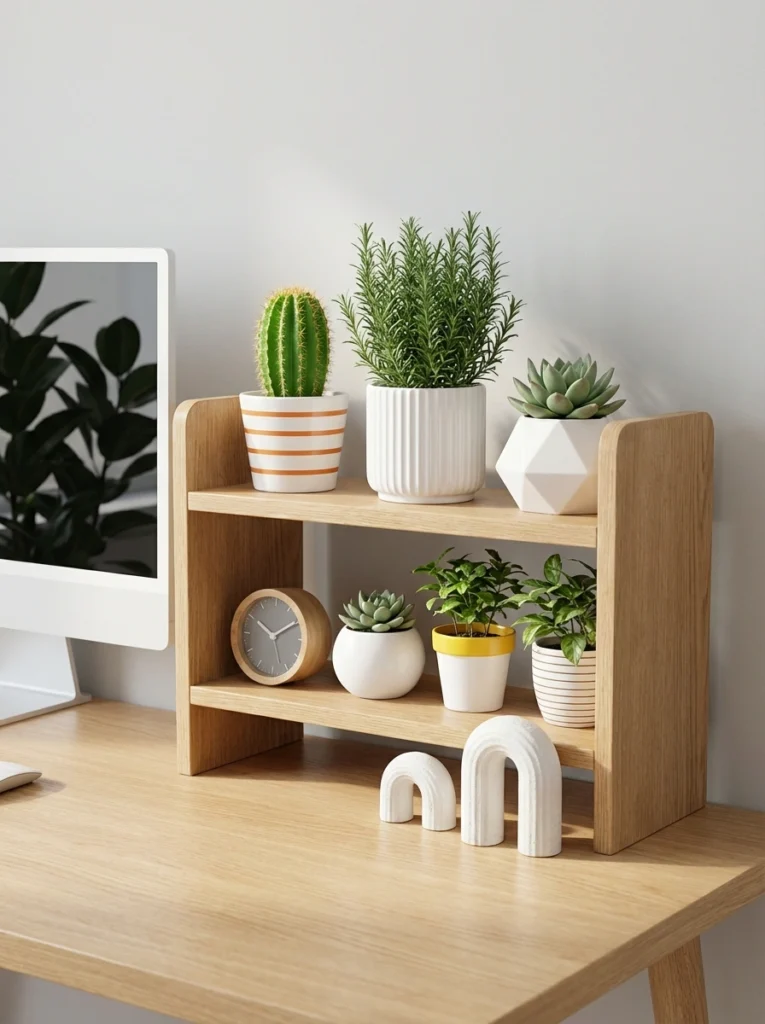 Even if you’re stuck at a desk all day, you deserve a little nature. A mini two-tier riser is the perfect way to keep your workspace organized and green. It lifts your plants off the actual desk surface, leaving room for your computer and coffee. Pairing a functional clock with a few hardy succulents or herbs like rosemary creates a workspace that feels fresh, productive, and a little more like home.