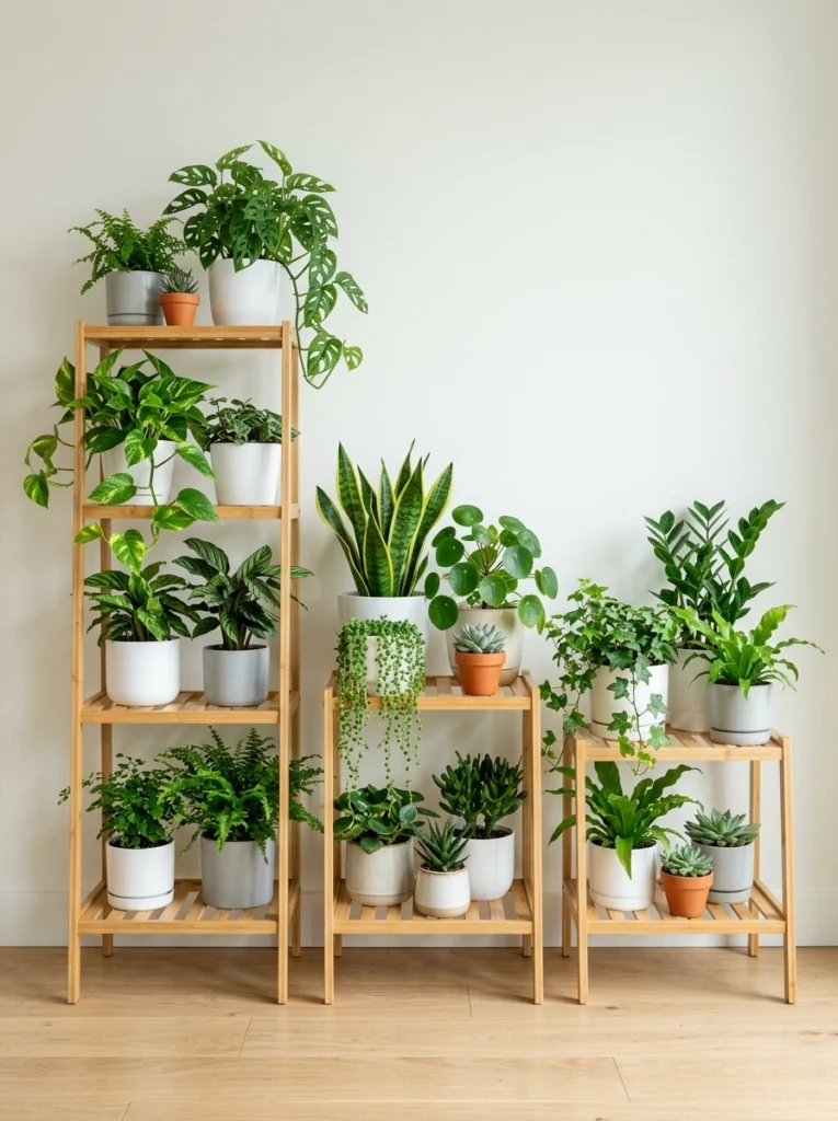 If you love a clean, organized aesthetic, light wood shelving units are your best friend. By grouping three stands of varying heights, you create a rhythmic flow that keeps the eye moving. Sticking to a consistent pot palette—like whites and soft greys—ensures the focus remains entirely on the unique shapes of the foliage. It’s an effortless way to turn a blank wall into a living gallery that feels curated and calm.
