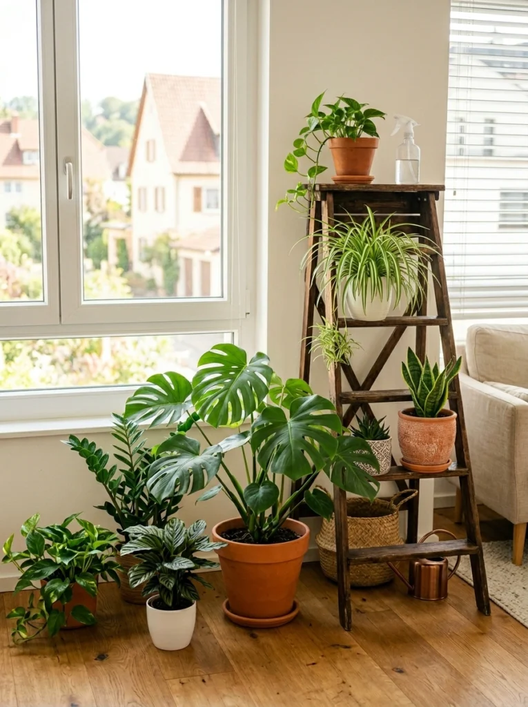 Repurposed wooden ladders bring a wonderful sense of history and warmth to a room. Tucking one into a corner near a large window allows you to stagger plants so they each get their fair share of Vitamin D. Pairing a tall, structural Monstera on the floor with trailing vines on the upper rungs creates a beautiful “waterfall” effect. It’s a soulful, rustic approach that proves you don’t need high-end furniture to make a statement.