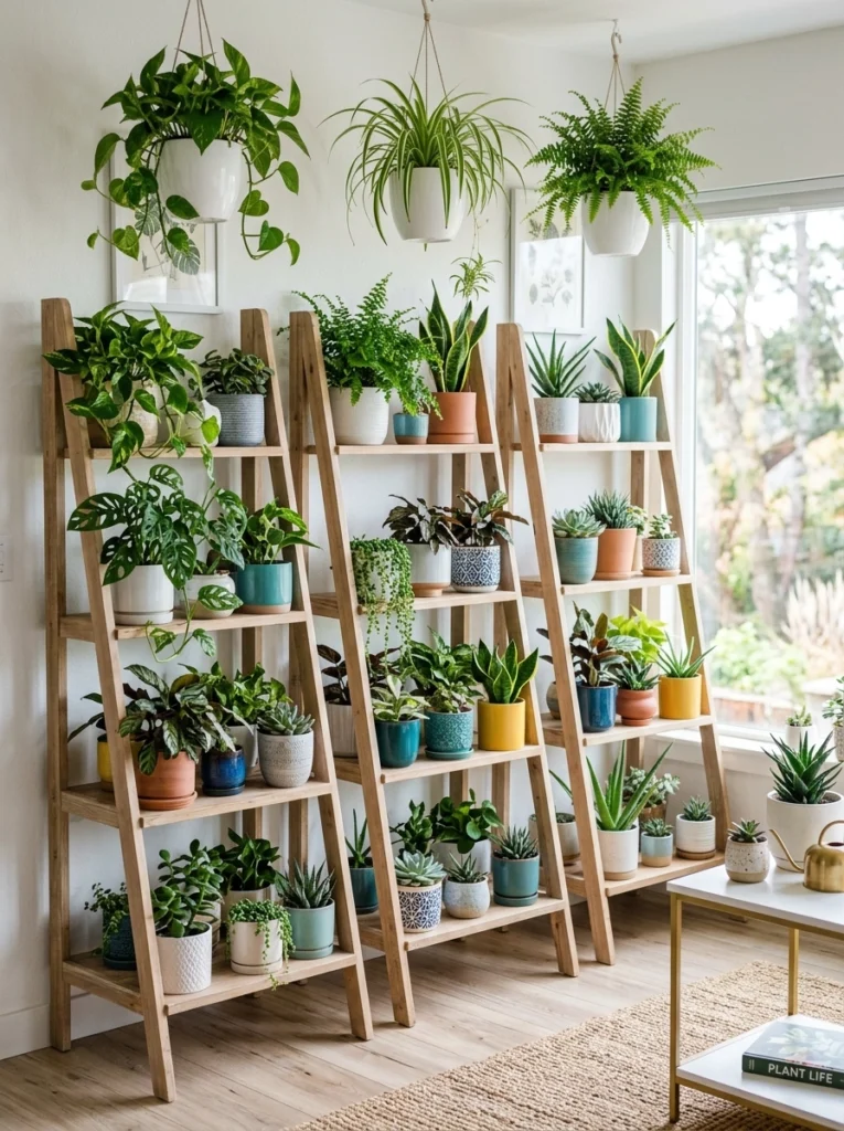 Why settle for one stand when you can have three? Lining up matching A-frame shelves creates a massive impact, turning a single wall into a botanical library. I love how the repetition of the light wood frames provides a structured backdrop for a chaotic mix of textures. Hanging a few pots from the ceiling at different levels adds that final layer of depth, making the entire room feel like it’s breathing.