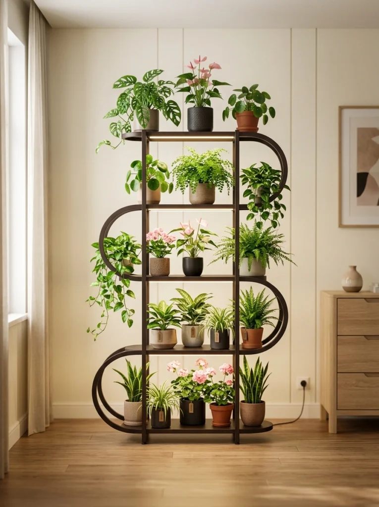 Sometimes the stand itself is the art piece. This S-curved dark wood unit is a total showstopper. The built-in lighting is a game-changer, especially for those darker corners where plants usually struggle. It’s a sophisticated, modern take on the traditional plant shelf. By placing flowering plants like Anthuriums on the middle tiers, you add pops of color that break up the greenery, making the whole display feel balanced and upscale.