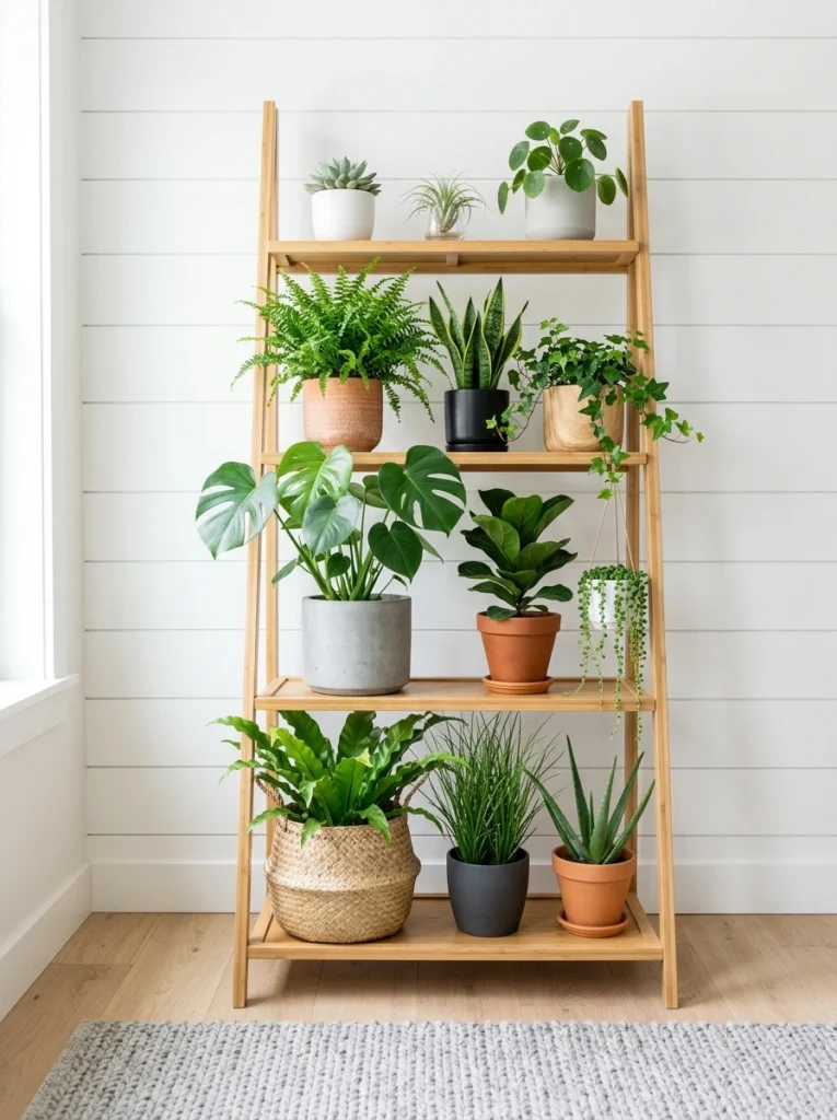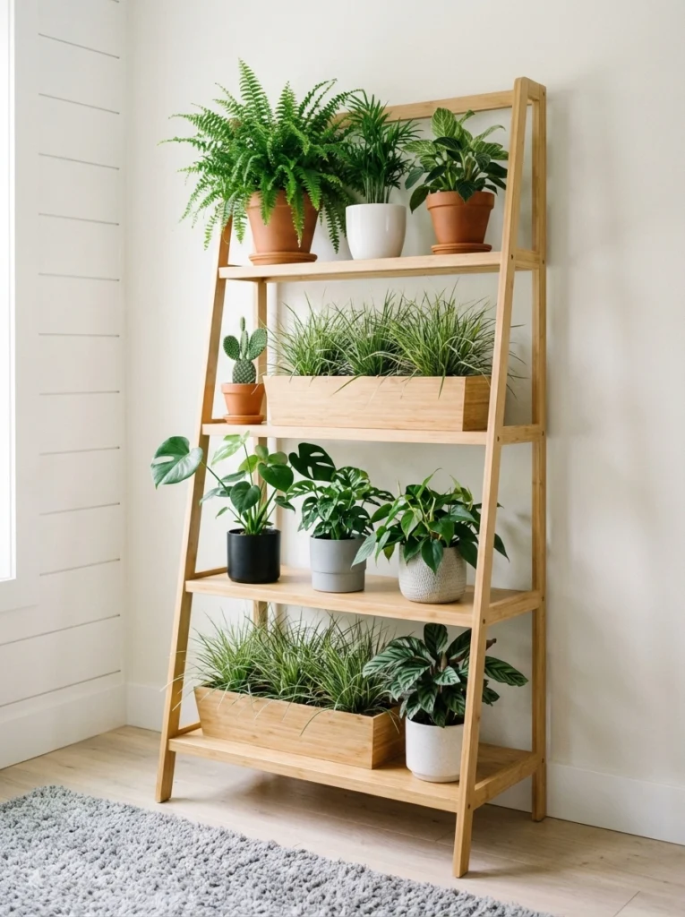 This wide, four-tier wooden shelf is perfect for the “plant parent” who loves a bit of order. Using long rectangular troughs for grasses or smaller succulents creates clean horizontal lines that look very modern. Balancing larger, leafy plants on the top and bottom rungs keeps the unit stable and visually grounded. It’s a great way to showcase a high volume of plants while keeping everything looking tidy and easy to mist.