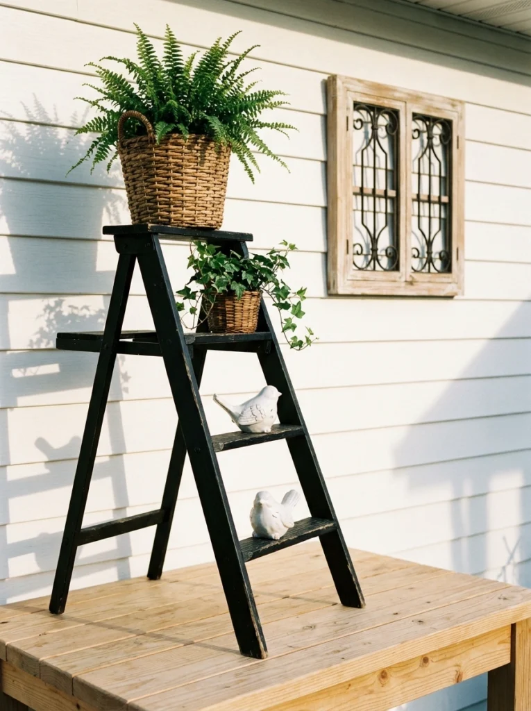 For an outdoor or mudroom vibe, a weathered black step ladder is a fantastic choice. It’s sturdy, unpretentious, and looks better the more it’s used. Topped with a large fern in a wicker basket, it creates a nostalgic, farmhouse feel. Adding a few decorative elements, like small ceramic birds, gives the display a bit of personality. It’s a great example of how intentional decor can turn a utility item into a focal point.