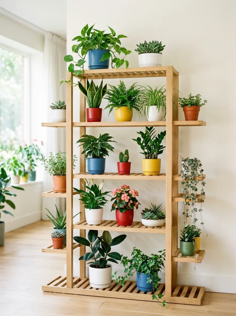 I’m obsessed with this oversized grid-style stand. It offers so many different “stages” for your plants to shine. The side-mounted shelves are perfect for trailing ivy or String of Hearts, allowing them to spill over the edges naturally. By mixing colorful pots in shades of blue, red, and yellow, you inject a sense of playfulness and energy into the room. It’s a bold choice that celebrates the diversity of your collection.