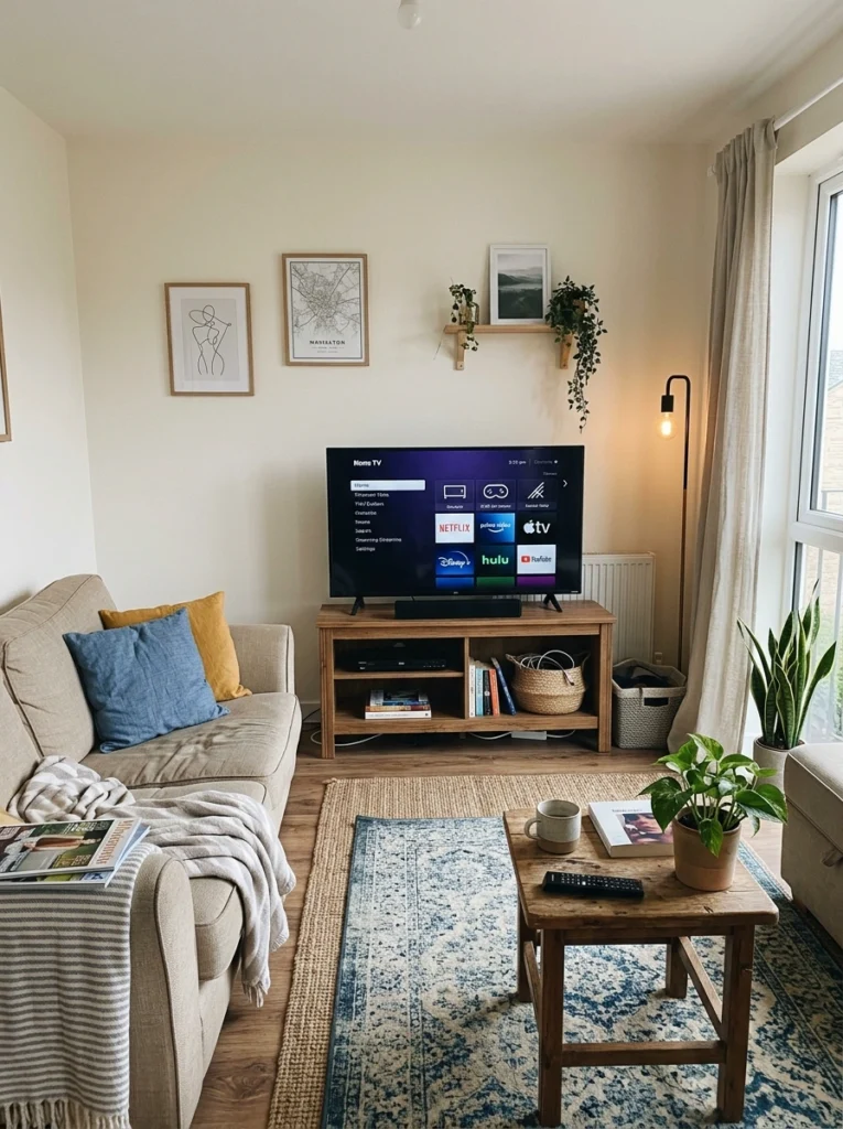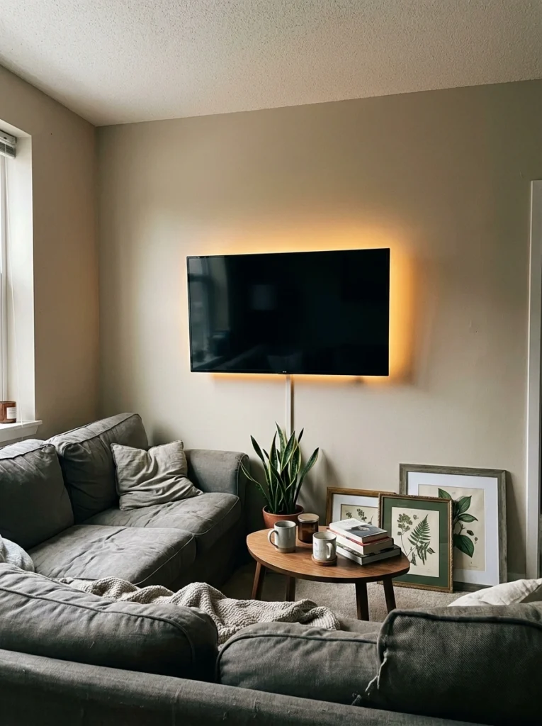 The Concept: Adding bias lighting (a soft glow behind your TV) completely changes the mood of the room when the sun goes down, making movie nights feel incredibly premium.