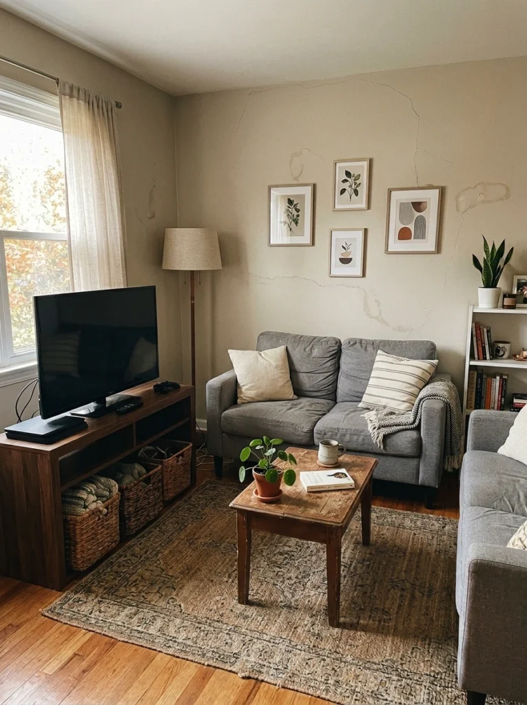 Why It Works: Natural textures warm up a room instantly. Using budget living room ideas like affordable baskets keeps the messy everyday items completely hidden, maintaining that clean, modern aesthetic.