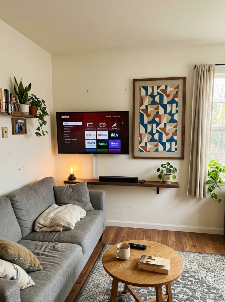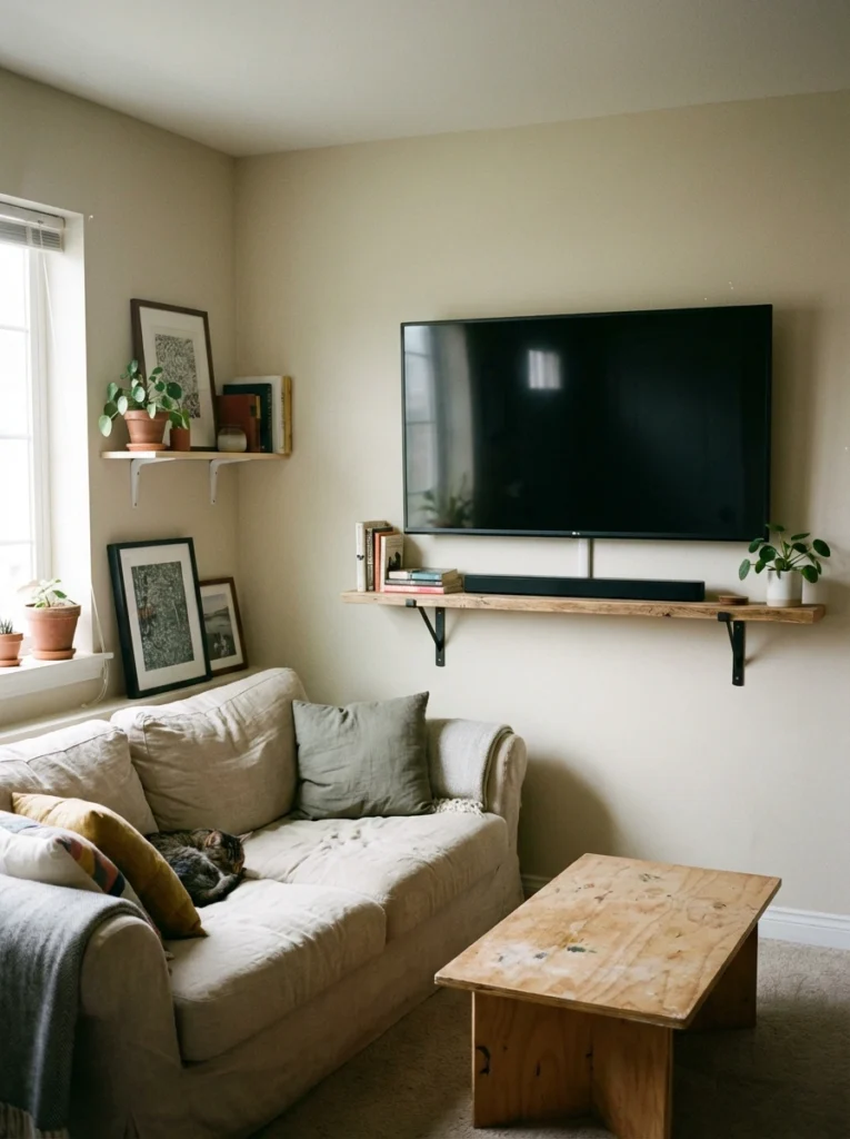 The Concept: Ditch the massive, heavy entertainment center. Mounting your TV and adding a simple floating shelf underneath instantly modernizes the space and makes the floor area feel wider.