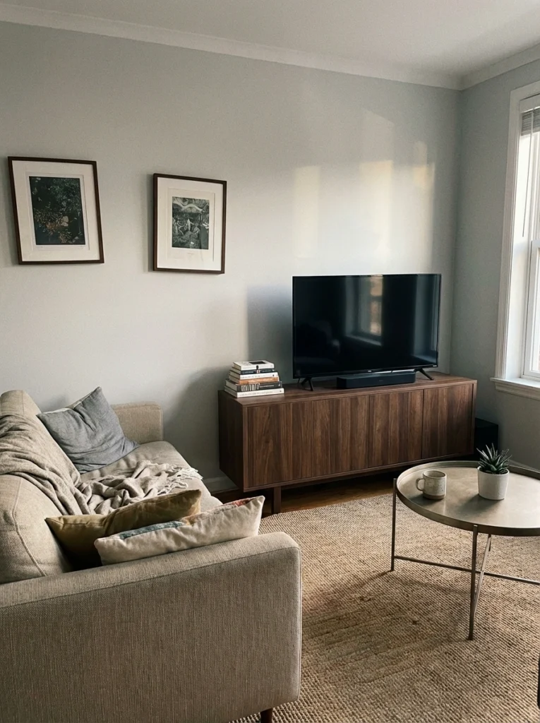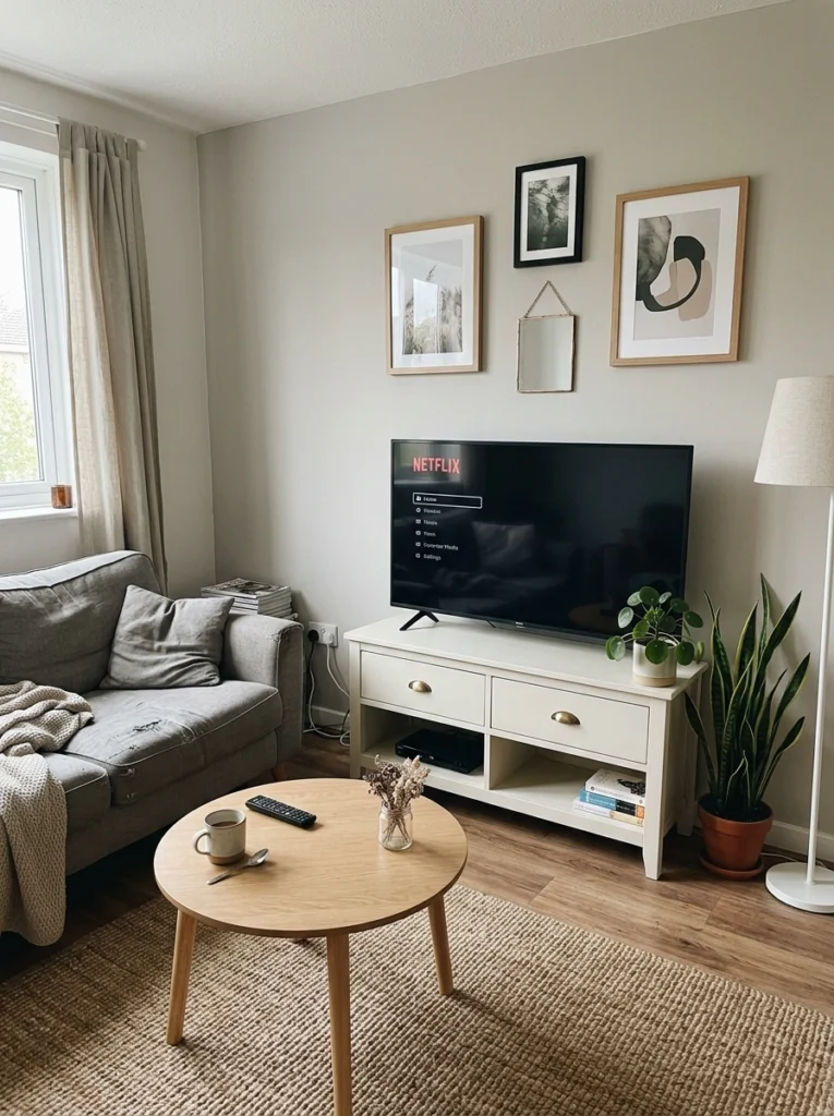 Why It Works: This is the ultimate cheap TV room decor hack. It adds massive architectural interest to a blank space without requiring any actual construction, giving you a custom DIY TV wall for less than the price of a fancy coffee.