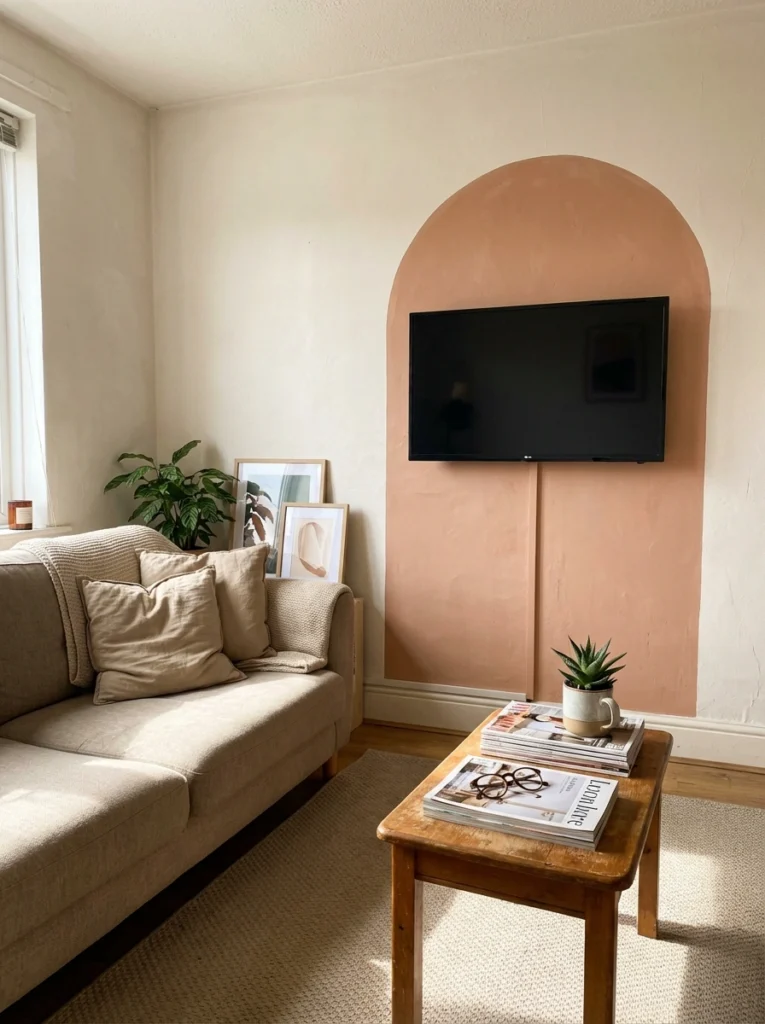 The Concept: Use paint to create a distinct zone for your television. Painting an arch or a large color-blocked rectangle behind the screen frames it beautifully and makes the TV look like a deliberate piece of art.