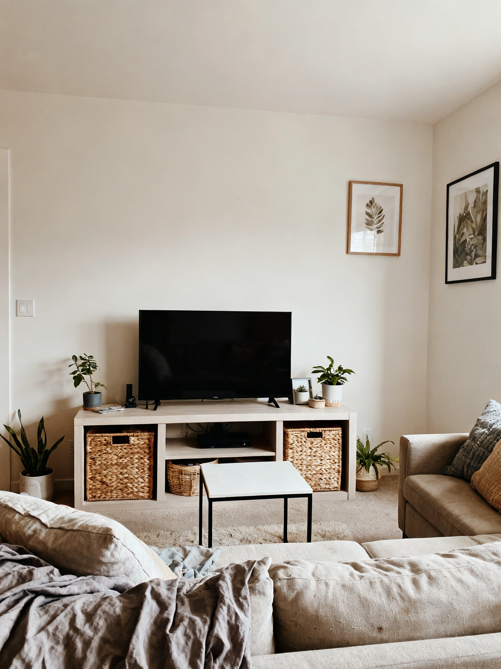 Why It Works: Natural textures warm up a room instantly. Using budget living room ideas like affordable baskets keeps the messy everyday items completely hidden, maintaining that clean, modern aesthetic.
