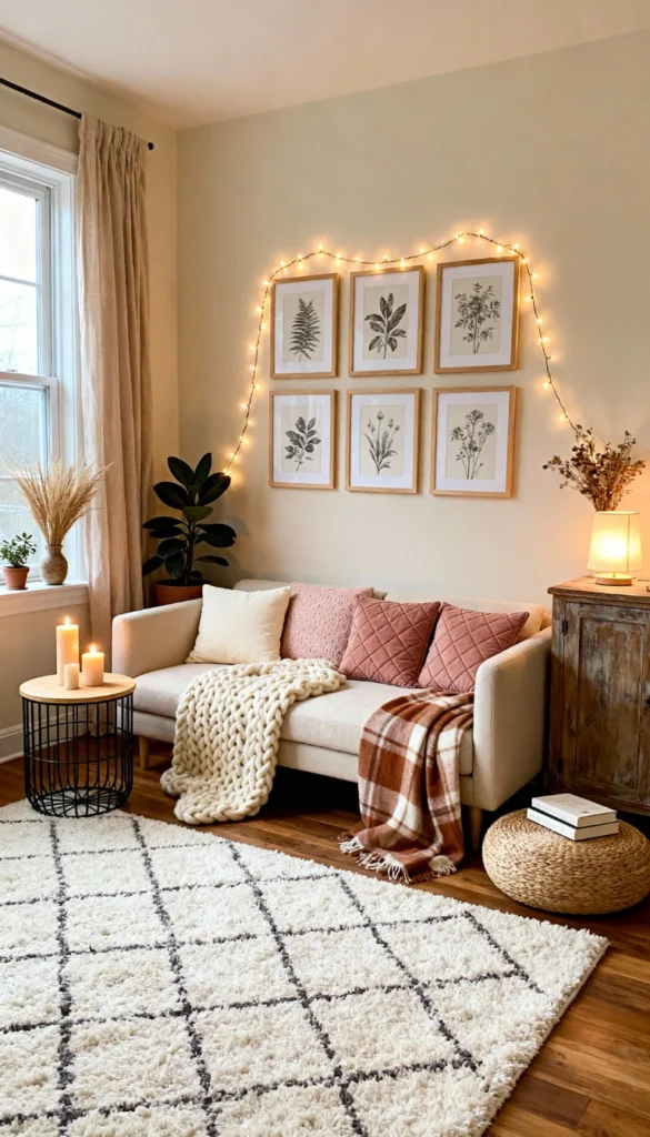 Drape a strand of warm string lights loosely over a symmetric grid of botanical prints to instantly soften the mood. Choose light wood frames to keep the aesthetic airy and organic. Layer your sofa with pillows in varying shades of blush pink and cream velvet for a gentle touch of color. Throw a chunky, oversized knit blanket over the seat to invite immediate relaxation. Place a tall, dark-leafed rubber plant in the corner to ground the pastel tones. Keep the lighting low and rely on pillar candles for a magical, cozy evening atmosphere.