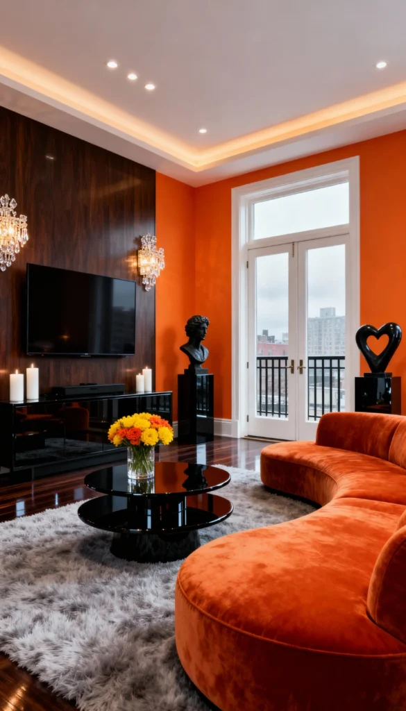 Embrace color fearlessly by painting your walls a vibrant, saturated orange. Contrast the brightness with a sleek, dark wood feature wall to mount your television. Select a curved, velvet sofa in a matching burnt-orange hue to create a seamless, high-end lounge feel. Ground the space with a plush, silver-grey shag rug that adds texture underfoot. Install crystal wall sconces and a matching chandelier to introduce sparkle and luxury. Finish with glossy black accents, like a two-tiered round coffee table and abstract sculptures, to sharpen the look.