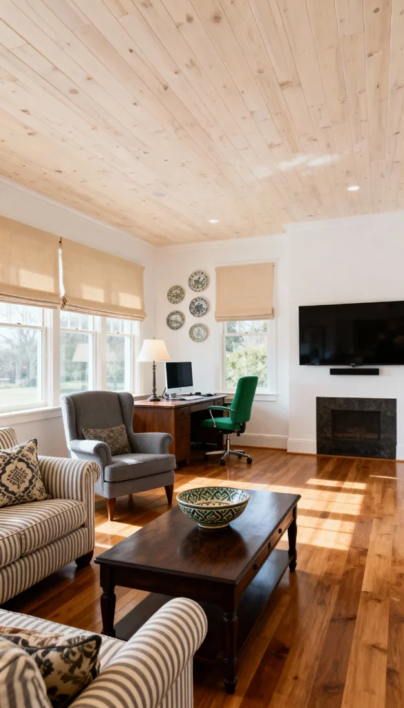 Highlight architectural beauty with a light, natural wood plank ceiling to draw the eye upward. Choose a classic striped armchair in blue and white to introduce a timeless, coastal feel. Place a solid wood desk near the window to take advantage of natural light, pairing it with a bright green office chair for a fun splash of color. Keep your walls crisp white to let the wood tones warm up the space. Arrange a collection of decorative blue and white plates on the wall to echo the traditional cottage aesthetic.
