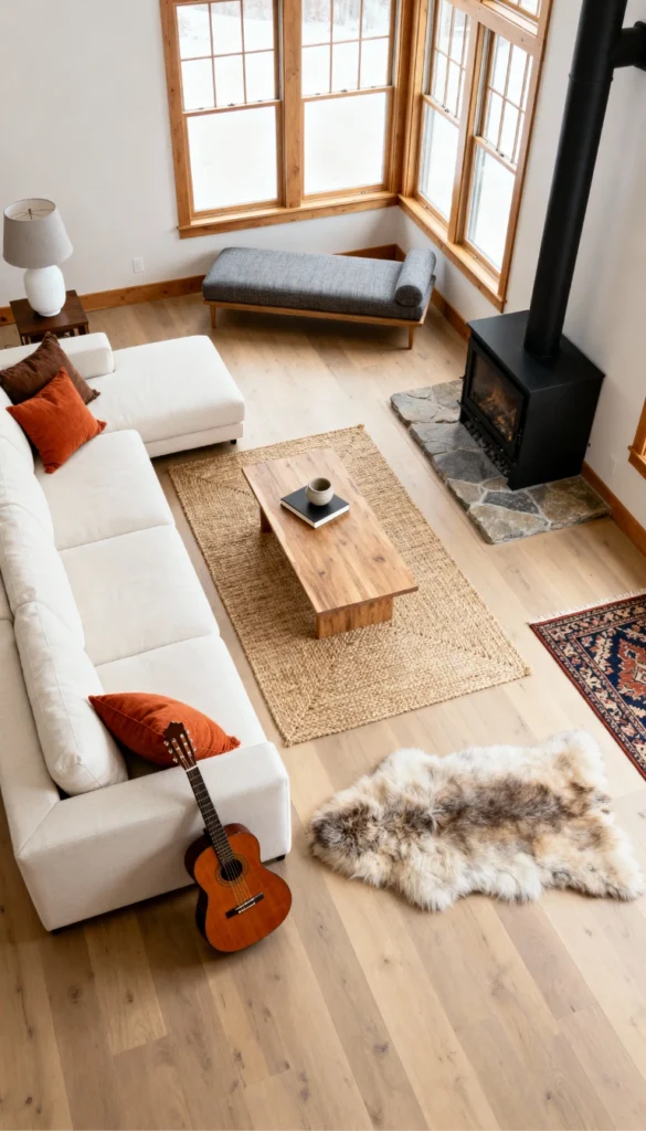 Create a serene sanctuary using a palette of crisp whites and natural woods. Opt for a large, white L-shaped sofa and accent it with rust-colored pillows for warmth. Lay a woven jute rug in the center of the room to define the seating area with natural texture. Place a sleek wood-burning stove in the corner to serve as a cozy focal point. Soften the hardwood floors with a genuine sheepskin rug.
